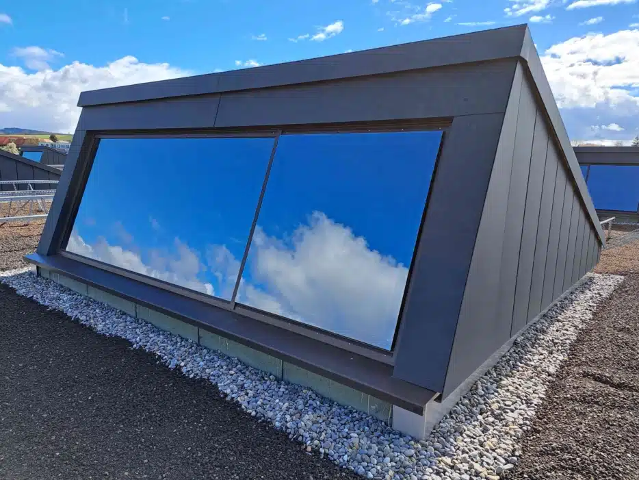 Kurzbeschrieb: Oblicht-Pfosten-Riegel-Fassade, Fenster aus Aluminium