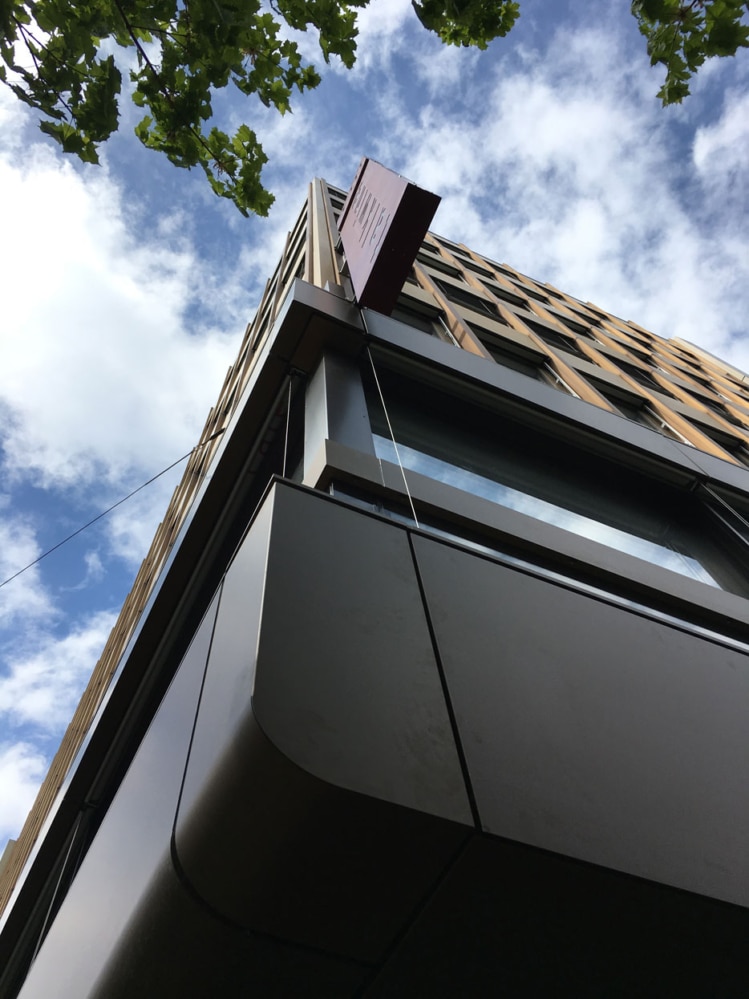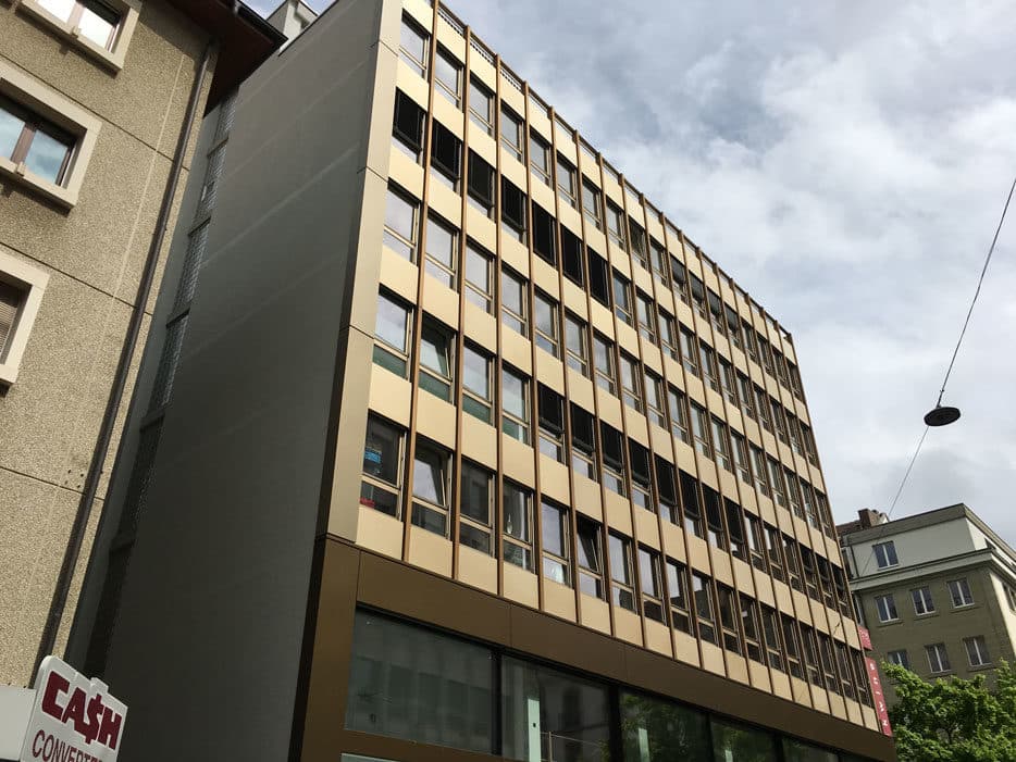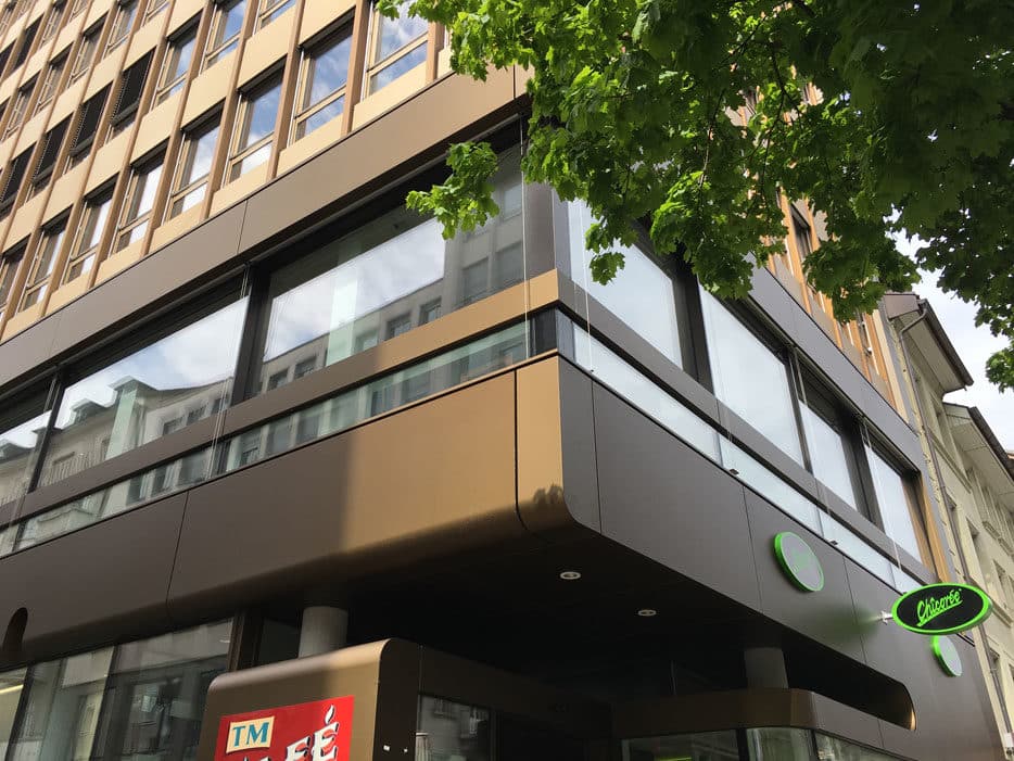 Kurzbeschrieb: Fassadensanierung, Pfosten-Riegel Fassade rund, Ganzglas-Schiebefenster Reynaers HIFINITY
